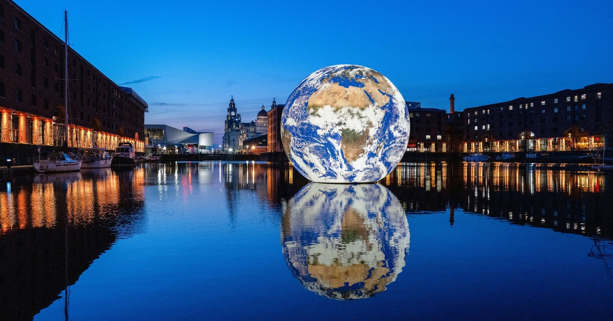 A sphere earth artwork floating in the middle of the docks surrounded by buildings and lit up at night